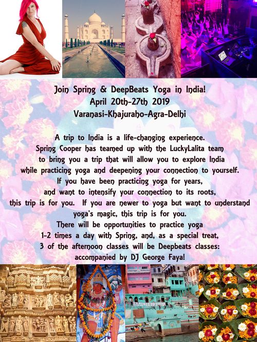 A trip to India is a life-changing experience. Spring Cooper has teamed up with the LuckyLalita team to bring you a trip that will allow you to explore India while practicing yoga and deening your connection to yourself. If you have been practicing yoga for years, and want to intensify your connection to its roots, this trip is for you. If you are newer to yoga but want to understand yoga's magic, this trip is for you. Tthere will be opportunities to practice yoga 1-2 times a day with Spring, and, as a special treat, 3 of the afternoon classes will be Deepbeats classes: accompanied by DJ George Faya!